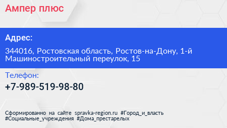 Ампер плюс по адресу 344016, Ростовская область, Ростов-на-Дону, 1-й Машиностроительный переулок, 15 в дальнейшем Организация, размещена в следующих категориях: