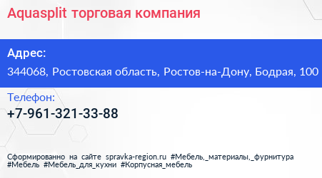Aquasplit, торговая компания по адресу 344068, Ростовская область, Ростов-на-Дону, Бодрая, 100 в дальнейшем Организация, размещена в следующих категориях: