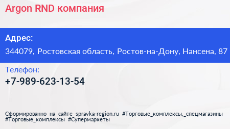 Argon-RND, компания по адресу 344079, Ростовская область, Ростов-на-Дону, Нансена, 87 в дальнейшем Организация, размещена в следующих категориях: