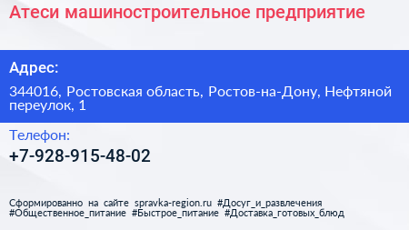 Атеси, машиностроительное предприятие по адресу 344016, Ростовская область, Ростов-на-Дону, Нефтяной переулок, 1 в дальнейшем Организация, размещена в следующих категориях: