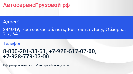 АвтосервисГрузовой.рф по адресу 344049, Ростовская область, Ростов-на-Дону, Обзорная 2-я, 54 в дальнейшем Организация, размещена в следующих категориях: