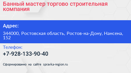 Банный мастер, торгово-строительная компания по адресу 344000, Ростовская область, Ростов-на-Дону, Нансена, 152 в дальнейшем Организация, размещена в следующих категориях: