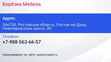 Берёзка-Мебель по адресу 346720, Ростовская область, Ростов-на-Дону, Новочеркасское шоссе, 20 в дальнейшем Организация, размещена в следующих категориях: