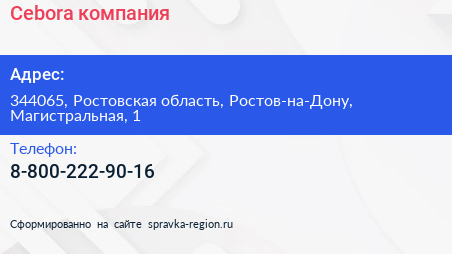 Cebora, компания по адресу 344065, Ростовская область, Ростов-на-Дону, Магистральная, 1 в дальнейшем Организация, размещена в следующих категориях:
