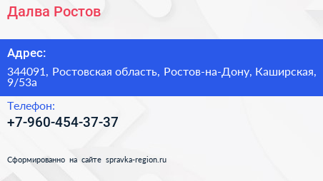 Далва Ростов по адресу 344091, Ростовская область, Ростов-на-Дону, Каширская, 9/53а в дальнейшем Организация, размещена в следующих категориях: