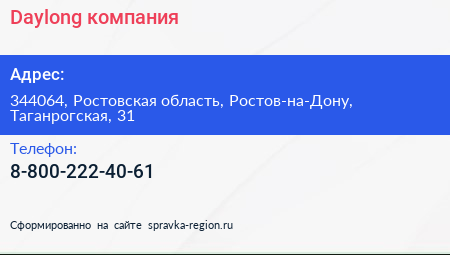Daylong, компания по адресу 344064, Ростовская область, Ростов-на-Дону, Таганрогская, 31 в дальнейшем Организация, размещена в следующих категориях: