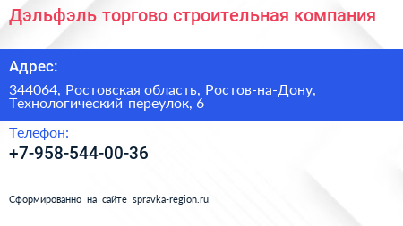 Дэльфэль, торгово-строительная компания по адресу 344064, Ростовская область, Ростов-на-Дону, Технологический переулок, 6 в дальнейшем Организация, размещена в следующих категориях: