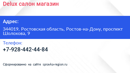 Delux, салон-магазин по адресу 344019, Ростовская область, Ростов-на-Дону, проспект Шолохова, 9 в дальнейшем Организация, размещена в следующих категориях: