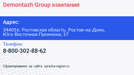 Demontazh Group, компания по адресу 344016, Ростовская область, Ростов-на-Дону, Юго-Восточная Промзона, 17 в дальнейшем Организация, размещена в следующих категориях: