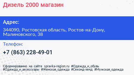 Дизель-2000, магазин по адресу 344090, Ростовская область, Ростов-на-Дону, Малиновского, 38 в дальнейшем Организация, размещена в следующих категориях: