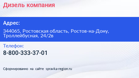 Дизель, компания по адресу 344065, Ростовская область, Ростов-на-Дону, Троллейбусная, 24/2в в дальнейшем Организация, размещена в следующих категориях: