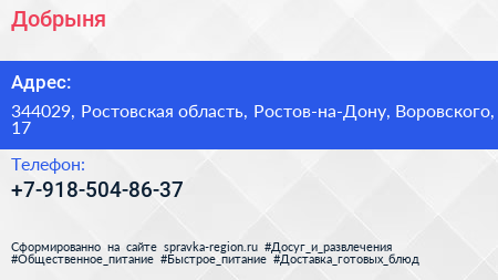 Добрыня по адресу 344029, Ростовская область, Ростов-на-Дону, Воровского, 17 в дальнейшем Организация, размещена в следующих категориях: