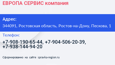 ЕВРОПА-СЕРВИС, компания по адресу 344091, Ростовская область, Ростов-на-Дону, Пескова, 1 в дальнейшем Организация, размещена в следующих категориях: