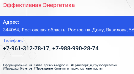 Эффективная Энергетика по адресу 344064, Ростовская область, Ростов-на-Дону, Вавилова, 56 в дальнейшем Организация, размещена в следующих категориях: