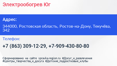Электрообогрев-Юг по адресу 344000, Ростовская область, Ростов-на-Дону, Текучёва, 342 в дальнейшем Организация, размещена в следующих категориях: