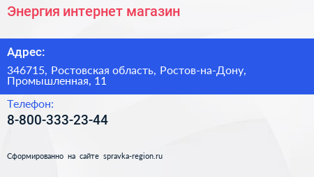 Энергия, интернет-магазин по адресу 346715, Ростовская область, Ростов-на-Дону, Промышленная, 11 в дальнейшем Организация, размещена в следующих категориях: