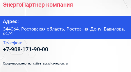 ЭнергоПартнер, компания по адресу 344064, Ростовская область, Ростов-на-Дону, Вавилова, 61/4 в дальнейшем Организация, размещена в следующих категориях: