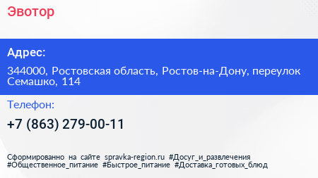 Для связи с организацией воспользуйтесь номером телефона: +7 (863) 279-00-11. Пн: c 09:00-18:00, Вт: c 09:00-18:00, Ср: c 09:00-18:00, Чт: c 09:00-18:00, Пт: c 09:00-18:00, Сб: выходной, Вс: выходной, вы можете обратиться в эту организацию.