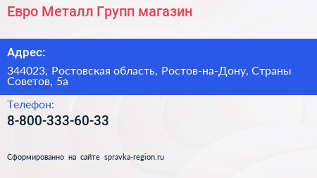 Евро Металл Групп, магазин по адресу 344023, Ростовская область, Ростов-на-Дону, Страны Советов, 5а в дальнейшем Организация, размещена в следующих категориях: