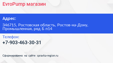 EvroPump, магазин по адресу 346715, Ростовская область, Ростов-на-Дону, Промышленная, ряд Б п14 в дальнейшем Организация, размещена в следующих категориях: