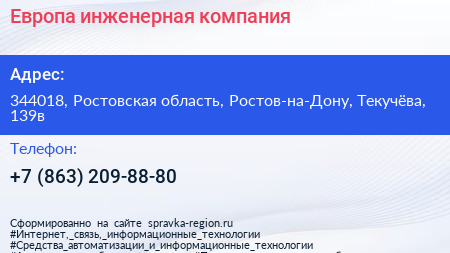 Европа, инженерная компания по адресу 344018, Ростовская область, Ростов-на-Дону, Текучёва, 139в в дальнейшем Организация, размещена в следующих категориях: