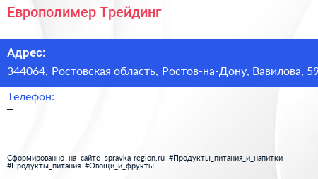 Европолимер-Трейдинг по адресу 344064, Ростовская область, Ростов-на-Дону, Вавилова, 59 в дальнейшем Организация, размещена в следующих категориях: