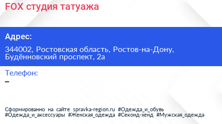 FOX, студия татуажа по адресу 344002, Ростовская область, Ростов-на-Дону, Будённовский проспект, 2а в дальнейшем Организация, размещена в следующих категориях: