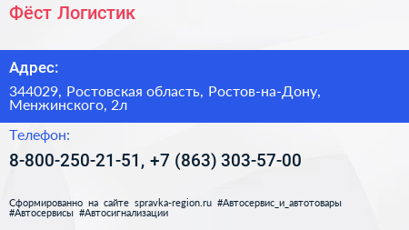 Фёст Логистик по адресу 344029, Ростовская область, Ростов-на-Дону, Менжинского, 2л в дальнейшем Организация, размещена в следующих категориях: