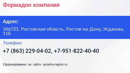 Формадон, компания по адресу 346721, Ростовская область, Ростов-на-Дону, Жданова, 11Б в дальнейшем Организация, размещена в следующих категориях: