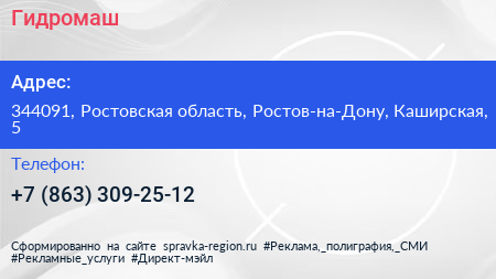 Гидромаш по адресу 344091, Ростовская область, Ростов-на-Дону, Каширская, 5 в дальнейшем Организация, размещена в следующих категориях: