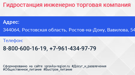 Гидростанция, инженерно-торговая компания по адресу 344064, Ростовская область, Ростов-на-Дону, Вавилова, 54 в дальнейшем Организация, размещена в следующих категориях: