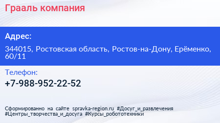 Грааль, компания по адресу 344015, Ростовская область, Ростов-на-Дону, Ерёменко, 60/11 в дальнейшем Организация, размещена в следующих категориях: