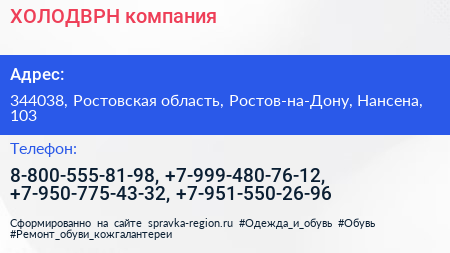 ХОЛОДВРН, компания по адресу 344038, Ростовская область, Ростов-на-Дону, Нансена, 103 в дальнейшем Организация, размещена в следующих категориях: