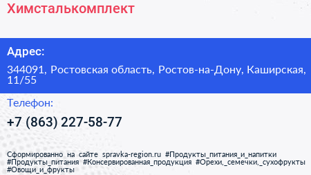Химсталькомплект по адресу 344091, Ростовская область, Ростов-на-Дону, Каширская, 11/55 в дальнейшем Организация, размещена в следующих категориях: