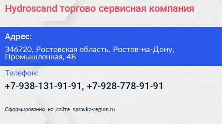 Hydroscand, торгово-сервисная компания по адресу 346720, Ростовская область, Ростов-на-Дону, Промышленная, 4Б в дальнейшем Организация, размещена в следующих категориях: