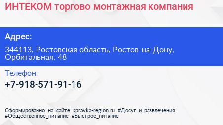 ИНТЕКОМ, торгово-монтажная компания по адресу 344113, Ростовская область, Ростов-на-Дону, Орбитальная, 48 в дальнейшем Организация, размещена в следующих категориях: