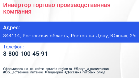 Инвертор, торгово-производственная компания по адресу 344114, Ростовская область, Ростов-на-Дону, Южная, 25г в дальнейшем Организация, размещена в следующих категориях: