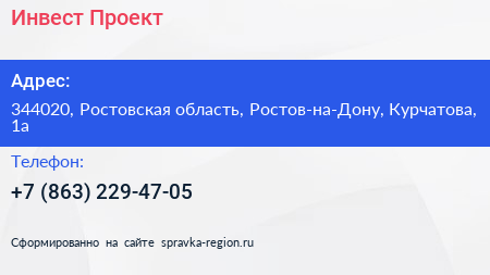 Инвест Проект по адресу 344020, Ростовская область, Ростов-на-Дону, Курчатова, 1а в дальнейшем Организация, размещена в следующих категориях: