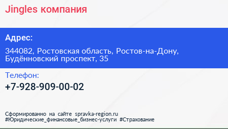 Jingles, компания по адресу 344082, Ростовская область, Ростов-на-Дону, Будённовский проспект, 35 в дальнейшем Организация, размещена в следующих категориях:
