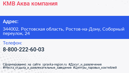 КМВ-Аква, компания по адресу 344002, Ростовская область, Ростов-на-Дону, Соборный переулок, 24 в дальнейшем Организация, размещена в следующих категориях: