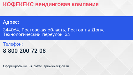 КОФЕКЕКС, вендинговая компания по адресу 344064, Ростовская область, Ростов-на-Дону, Технологический переулок, 3а в дальнейшем Организация, размещена в следующих категориях:
