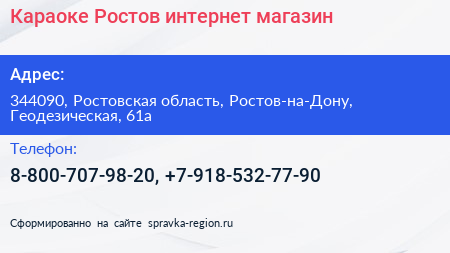 Караоке-Ростов, интернет-магазин по адресу 344090, Ростовская область, Ростов-на-Дону, Геодезическая, 61а в дальнейшем Организация, размещена в следующих категориях: