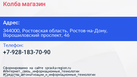 Колба, магазин по адресу 344000, Ростовская область, Ростов-на-Дону, Ворошиловский проспект, 46 в дальнейшем Организация, размещена в следующих категориях: