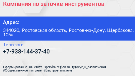 Компания по заточке инструментов по адресу 344020, Ростовская область, Ростов-на-Дону, Щербакова, 105а в дальнейшем Организация, размещена в следующих категориях: