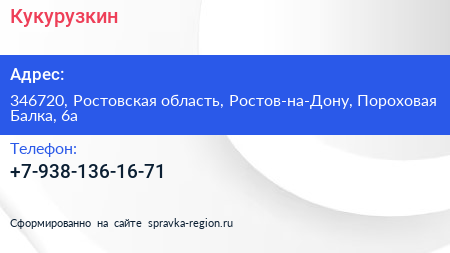 Кукурузкин по адресу 346720, Ростовская область, Ростов-на-Дону, Пороховая Балка, 6а в дальнейшем Организация, размещена в следующих категориях: