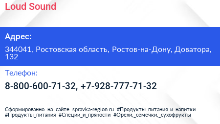 Loud Sound по адресу 344041, Ростовская область, Ростов-на-Дону, Доватора, 132 в дальнейшем Организация, размещена в следующих категориях: