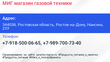 МИГ, магазин газовой техники по адресу 344038, Ростовская область, Ростов-на-Дону, Нансена, 219 в дальнейшем Организация, размещена в следующих категориях: