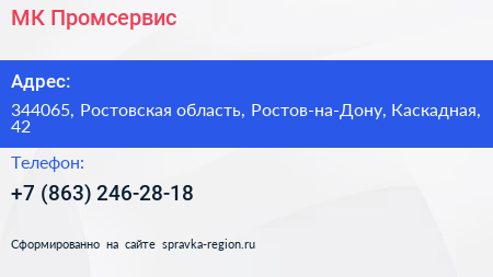 МК-Промсервис по адресу 344065, Ростовская область, Ростов-на-Дону, Каскадная, 42 в дальнейшем Организация, размещена в следующих категориях: