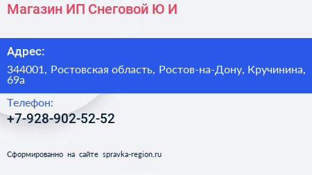 Магазин, ИП Снеговой Ю.И. по адресу 344001, Ростовская область, Ростов-на-Дону, Кручинина, 69а в дальнейшем Организация, размещена в следующих категориях:
