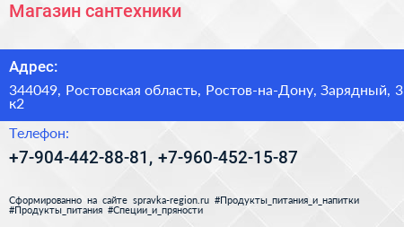 Магазин сантехники по адресу 344049, Ростовская область, Ростов-на-Дону, Зарядный, 3 к2 в дальнейшем Организация, размещена в следующих категориях: